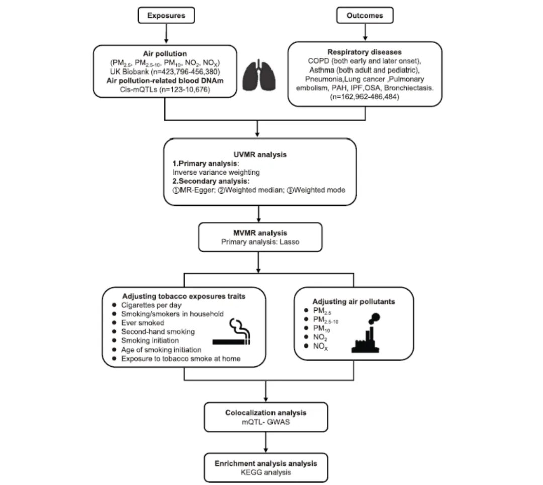 在该研究中,团队首先将多种空气污染物(PM2.5,PM2.5-10,PM10,NO2,NOX)作为暴露,将COPD、哮喘、肺炎、肺部肿瘤、肺栓塞、肺动脉高压(PAH)、睡眠呼吸暂停(OSA)、特发性间质性肺炎、支气管扩张等9类常见呼吸系统慢性疾病及其不同亚型作为结局,使用UVMR探索空气污染物与呼吸系统疾病的因果关系,并且使用MVMR调整污染物之间及香烟暴露潜在的混杂因素以及空气污染物之间的相互影响以增加结果的可靠性;其次,通过共定位分析,探索甲基化在污染物导致不同呼吸系统慢性疾病中的作用;最后,通过对空气污染物暴露和疾病结果显著相关的基因变异进行富集分析,明确其可能的基因通路。(图1)