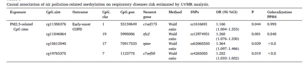综上所述,该研究明确了不同空气污染物在不同呼吸系统疾病中起到的关键性作用,尤其是PM2.5与PM10在导致早发型COPD与肺炎发生的决定性作用;同时该研究证明了cg11386376位点(定位于基因c1orf175)的甲基化是PM2.5导致早发型COPD可能的分子学机制。这些发现从基因层面揭示了各种空气污染物之间复杂的相互作用及其与呼吸道疾病的显著关联,并从表观遗传学和基因-环境相互作用的角度为呼吸系统疾病的复杂发病机制提供了新的视角。该研究的结论为有针对性的监管措施和公共卫生干预措施以减少有害空气污染物的暴露提供了理论依据,并为空气污染物导致的呼吸道疾病提供了潜在治疗靶点。