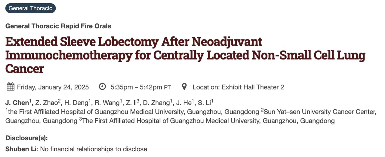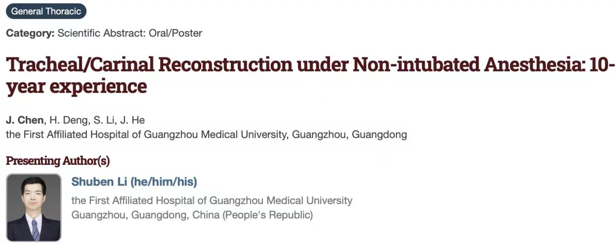 今年,国家呼吸医学中心广州医科大学附属第一医院何建行教授团队将携多项胸外科高质量成果亮相STS。团队的研究成果不仅以“壁报展示”和“口头汇报”两种形式向全球与会者分享团队在胸外科技术创新与临床应用方面的重要突破,同时也是近5年中国学者再次在STS “Thoracic Video”视频环节展示高难度手术(体外肺手术),向国际学术舞台发出“中国之声”。这些成果聚焦于胸外科精准诊疗的关键环节,涵盖技术创新、临床应用及治疗策略优化。通过此次国际交流,中心团队将进一步加强与全球胸外科专家的学术互动,为共同推动与提升中国胸外科的国际影响力注入新动力。