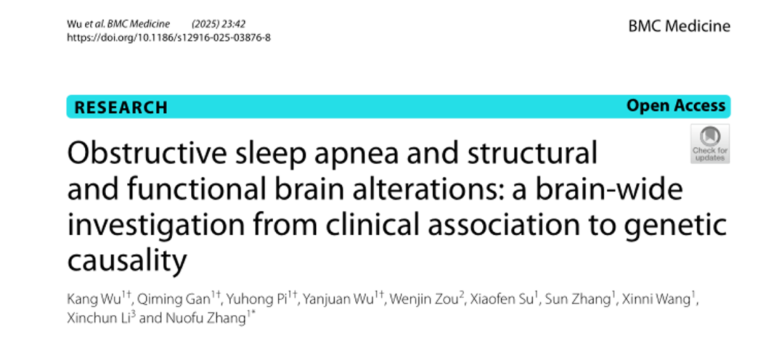 近日,国家呼吸医学中心/睡眠医学中心张挪富教授团队在国际权威期刊BMC Medicine(中科院1区Top,IF=7.1)上发表了一篇题为“Obstructive sleep apnea and structural and functional brain alterations: a brain-wide investigation from clinical association to genetic causality”的研究论文。该研究的通讯作者为广州医科大学附属第一医院、广州呼吸健康研究院、国家呼吸医学中心、睡眠医学中心的张挪富教授。广州医科大学附属第一医院的吴康主治医师、甘骑铭、皮于红、吴岩娟硕士研究生为论文的并列第一作者。