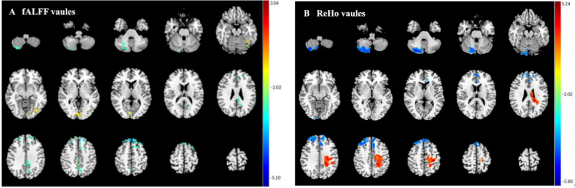 研究首先通过严格的OSA患者与健康受试者队列匹配(匹配因素包括年龄、性别、BMI、受教育程度等),利用多模态头颅MRI技术,通过体素形态学测量(VBM)、静息态功能磁共振成像(rs-fMRI)和扩散张量成像(DTI)全面评估了OSA患者全脑结构和功能的变化。VBM分析未发现OSA患者脑灰质体积的显著变化;rs-fMRI分析显示,OSA患者在右侧小脑后叶和双侧额上回及额中回表现出较低的低频波动分数幅值(fALFF)和区域均匀性(ReHo),而在左侧枕叶和左侧中央后回则表现出较高水平(图1)。DTI分析发现,OSA患者双侧上纵束的各向异性分数(FA)降低,表观扩散系数(ADC)增加。进一步分析表明,OSA患者的右侧上纵束(SLF)ADC值与最低血氧饱和度(LSaO2)呈正相关(r=0.449,P=0.047)。