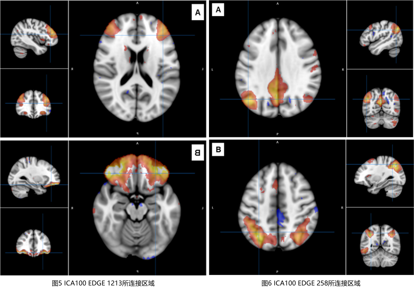 在孟德尔随机化分析中,研究结果显示OSA可能导致左侧颞下沟区域面积以及rs-fMRI连接网络中的ICA100 edge 893、edge 951、edge 1213等区域显著降低。同时,OSA还可能导致右侧额下回三角形部分平均厚度、右侧绒毡层方向离散度指数(OD)以及rs-fMRI连接网络中的ICA100 edge 258等区域显著增加(图2)。rs-fMRI连接网络中的ICA100 edge 893、edge 951、edge 1213以及ICA100 edge 258所连接的区域如图3-图6所示。