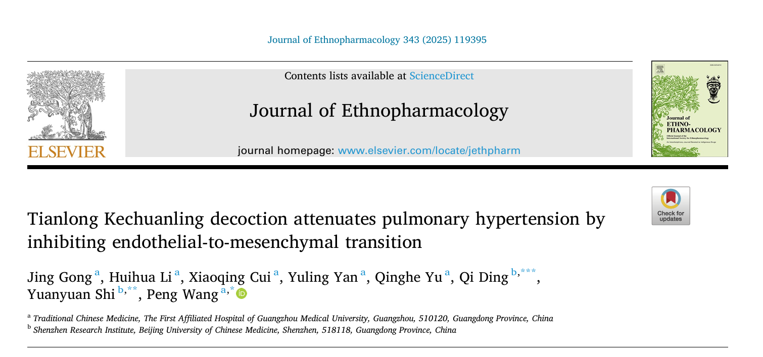 2025年2月3日,广州医科大附属第一医院王鹏教授团队联合北京中医药大学史渊源教授团队在药理学经典期刊《Journal of Ethnopharmacology》在线发表题为“Tianlong Kechuanling decoction attenuates pulmonary hypertension by inhibiting endothelial-to-mesenchymal transition”的原创研究,系统揭示了中药复方制剂天龙咳喘灵(现更名为天附咳喘胶囊)通过调控HIF-1α/VEGFA信号通路抑制内皮-间质转化,从而改善肺动脉高压血管重塑的关键机制。王鹏、史渊源和丁奇为共同通讯作者,龚静为第一作者。本研究获得国家自然科学基金项目、广州市科技局市校联合资助项目、深圳市科技创新项目等多个项目的资助和支持。