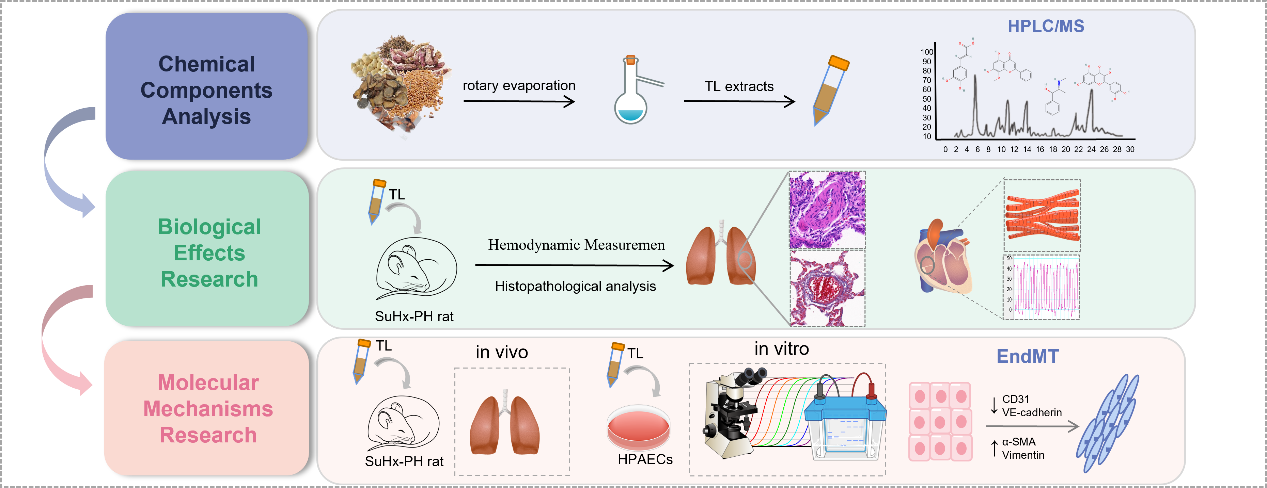 肺动脉高压是一种以血管重塑为特征的肺血管疾病,导致右心室重塑,最终可导致右心衰竭和死亡。目前的疗法主要针对前列环素、一氧化氮和内皮素信号通路的血管收缩异常,仍然缺乏针对血管重塑的有效治疗方法。本研究首次阐明TL通过多成分、多靶点调控End-MT及HIF-1α/VEGFA通路,为中药复方治疗PH提供了科学依据。团队进一步通过体内外模型验证TL的疗效,为其临床应用奠定了基础。