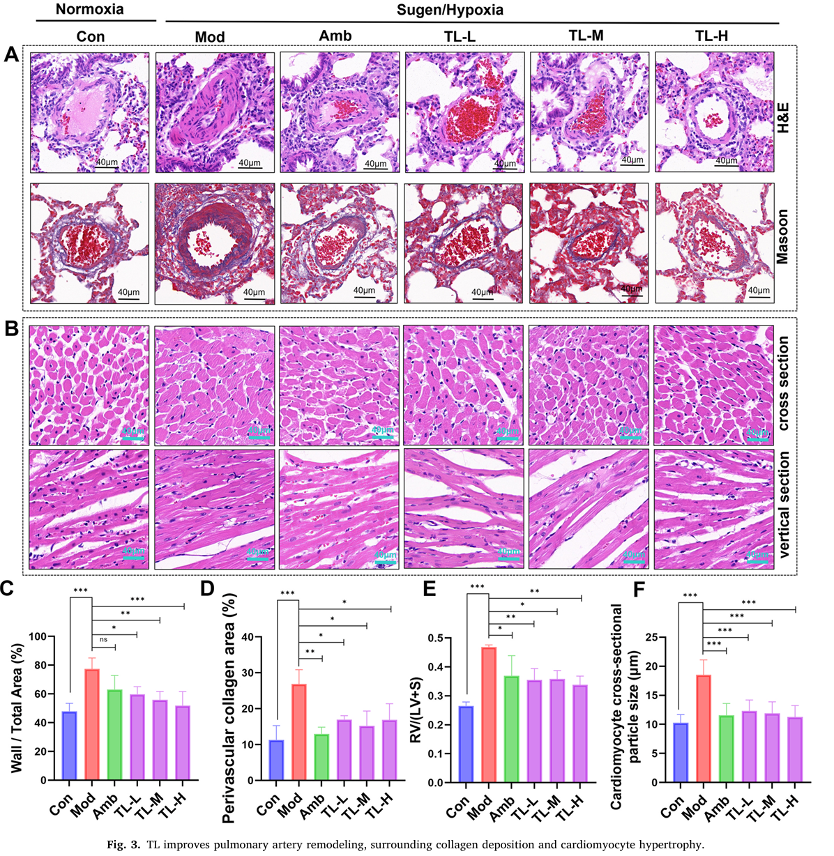 临床与实验验证:TL显著降低低氧联合SU5416联合低氧诱导的PH模型大鼠右心室收缩压(RVSP),改善肺动脉壁增厚及右心室肥厚;