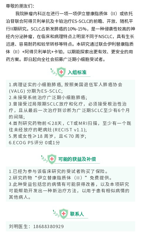 【受试者招募】1.未接受过全身治疗的广泛期小细胞肺癌患者