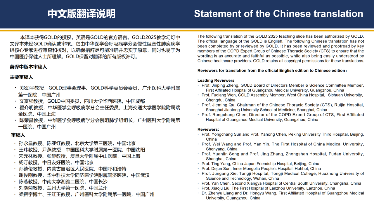 2025年3月17日,权威国际指南《慢性阻塞性肺疾病全球创议(GOLD 2025)》的教学幻灯中文版本在GOLD官网正式发布(https://goldcopd.org/wp-content/uploads/2025/03/GOLD-2025_teaching-slides-Chinese-version.pptx),由GOLD理事会理事及科学委员会委员、广州医科大学附属第一医院广州呼吸健康研究院的郑劲平教授团队牵头翻译,中华医学会呼吸病学分会核心专家团队审校。本译本严格遵循GOLD官方授权流程,经过国内权威专家的细致翻译、校对与优化,旨在为中国医疗工作者提供更贴合临床实践的慢阻肺诊疗与预防指导,推动我国呼吸系统疾病防治和教学水平的全面提升。