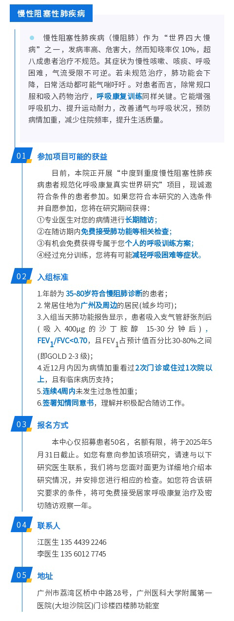 【受试者招募】招募中度到重度的慢阻肺患者,限50名!