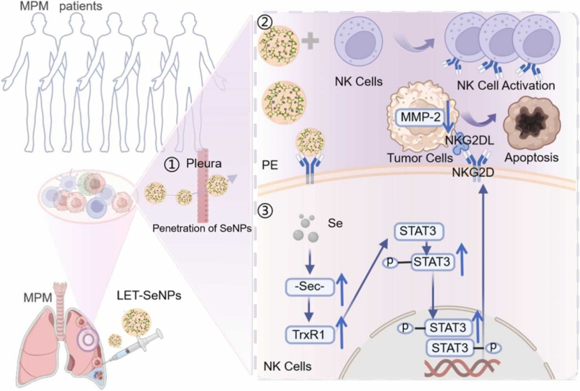 针对MPM的治疗,培美曲塞联合铂类化疗作为一线治疗方案的疗效存在局限性;近年来获批的“双免疫联合疗法(纳武利尤单抗+伊匹木单抗)”进展难言突破。究其原因,MPM复杂的肿瘤免疫微环境是关键因素。一方面,MPM呈现的”冷肿瘤”免疫状态导致以T细胞活化为核心的免疫疗法疗效有效;另一方面,MPM引起的类似石棉的“坚硬”的胸膜增厚,形成了物理屏障,使得众多药物难以有效渗透至病灶区域。针对这一特征,团队以MPM的肿瘤免疫微环境为切入点,深入分析并发现了其微环境中存在显著的微量元素硒缺乏现象。基于此,团队创新性地应用已经成功开发的具有免疫激活功能的纳米硒香菇多糖(LET-SeNPs),独辟蹊径,聚焦于NK细胞的调控机制。研究表明,LET-SeNPs能够显著提升胸腔积液中NK细胞的比例,并通过TrxR1-pSTAT3通路增强NKG2D介导的NK细胞对MPMD细胞的细胞毒性作用,从而实现高效的肿瘤杀伤效果。这一研究成果为LET-SeNPs在临床转化中的应用奠定了坚实的理论基础(图1)。可谓是“胸膜间皮瘤,坚不可摧,纳米材料来攻坚”。