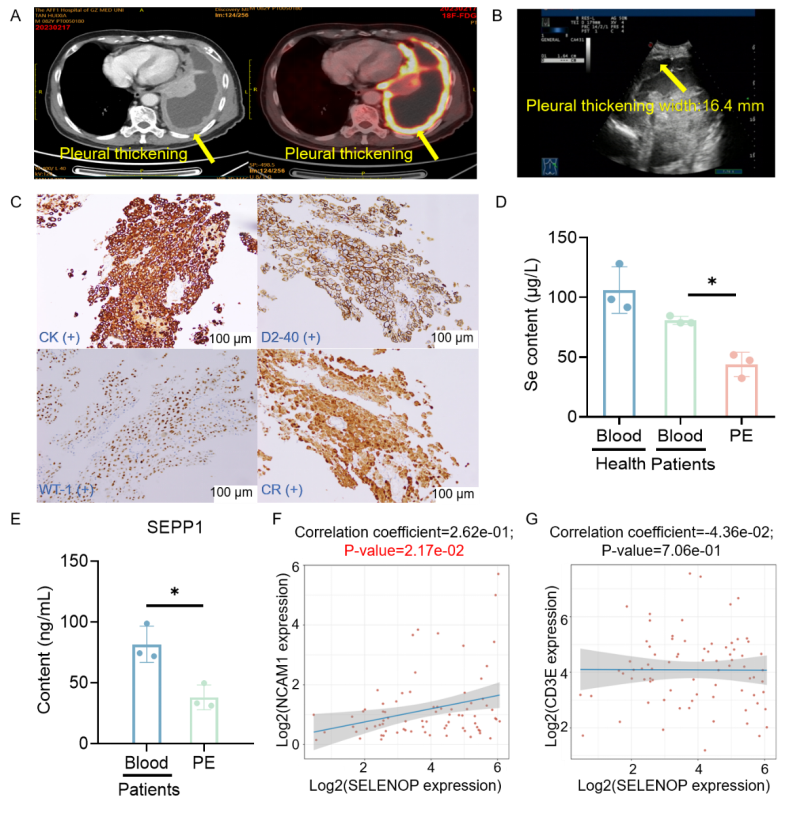 首先,汪金林教授团队充分利用近年来形成的“微创胸膜活检”这一专科技术优势,对MPM进行微创且精准的诊断。在此基础上,团队进一步深入研究了确诊病例中MPE的肿瘤免疫微环境,揭示了硒元素及其相关蛋白(SEPP1)的缺乏现象。研究还发现,这些缺乏与NK细胞的功能密切相关,而与T细胞功能之间的关联性相对较弱(图2)。