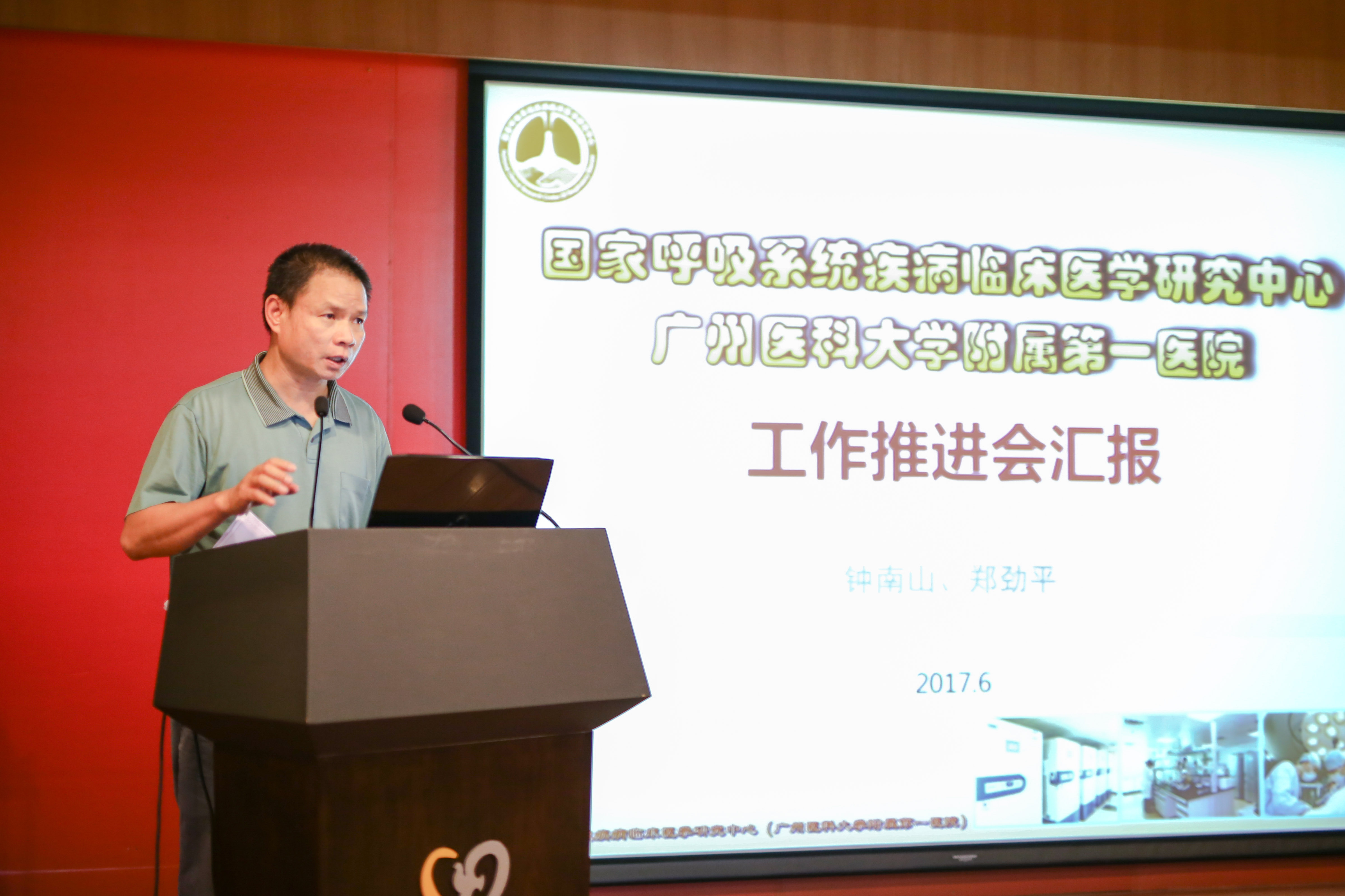 2017年6月5日,广州医科大学附属第一医院国家呼吸系统疾病临床医学研究中心工作推进会在广医一院医技楼8楼召开。广州医科大学党委书记冉丕鑫教授、副校长刘金保教授、科研处处长王健教授、国家呼吸系统疾病临床医学研究中心主任钟南山院士、副主任陈荣昌教授、何建行教授、郑劲平教授,呼研所黄庆晖副所长、医院科研科陈小清科长、临床中心全体工作人员,以及呼研所临床医师、护长等相关人员出席会议。