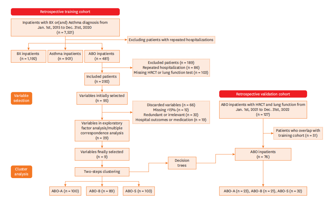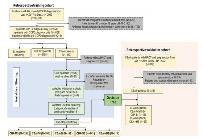 两项研究均基于住院患者数据库,采用了回顾性队列研究方法。在CBA研究中,团队纳入了2017-2020年间住院的2928例支气管扩张患者、5158例COPD患者及1219例CBA患者;ABO研究则聚焦于2015-2020年住院的292例ABO患者、901例哮喘患者与1192例支扩症患者。研究利用两步聚类分析法,结合决策树算法在独立验证集中检验分型的稳健性,确保了分型结果的可靠性。