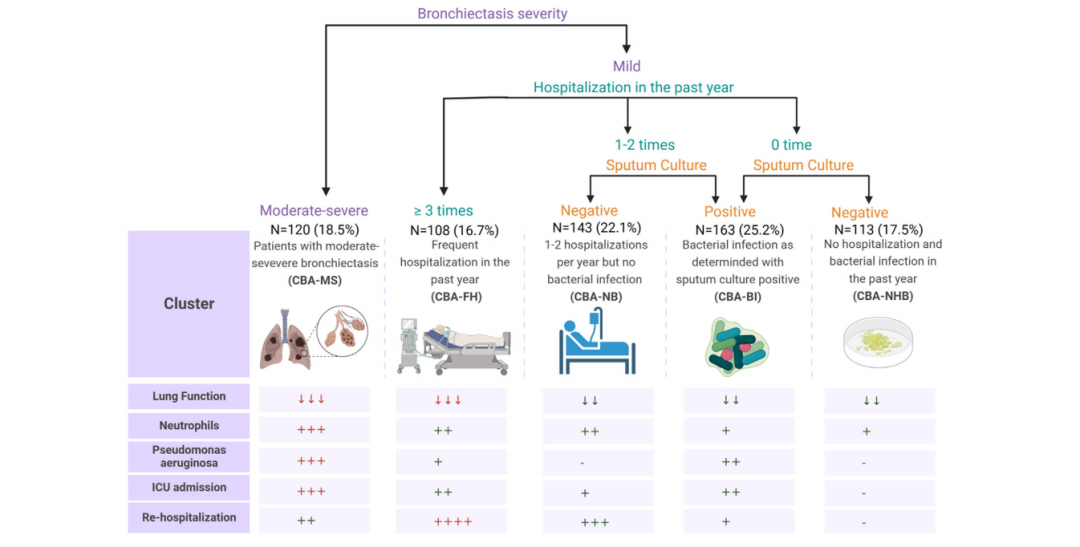 通过两步聚类法,识别出5种CBA亚型,包括以中重度支扩为主(CBA-MS)、频繁住院(CBA-FH)、细菌感染显著(CBA-BI)、少住院且无细菌感染(CBA-NB)、过去一年无住院或细菌感染的亚型(CBA-NHB)。其中,CBA-MS、CBA-BI和CBA-FH亚型的在住院及ICU转入风险显著高于CBA-NHB,CBA-FH预后最差,需强化抗菌治疗与气道管理。