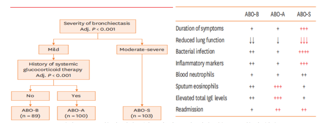 通过两步聚类法,发现了3种ABO临床亚型,即以哮喘症状为主导(ABO-A)、以支扩症特征占优势(ABO-B)、同时存在哮喘和中重度支扩症的亚型(ABO-S)。与ABO-B相比,ABO-A和ABO-S血嗜中性粒细胞比例更高、肺功能更差、住院时长更长,且在2年随访期内再住院风险显著增加。