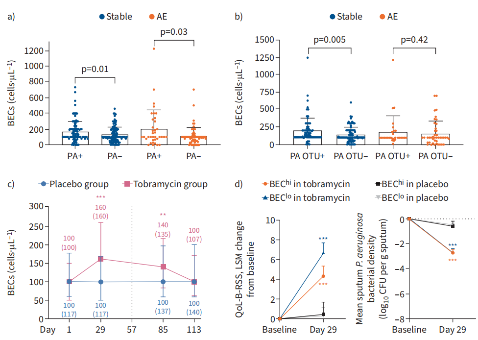 基于3期全国多中心双盲试验TORNASOL的事后分析显示,吸入妥布霉素治疗期间,BEC呈现“先升后降”的波动。首次治疗周期BEC升高(均数:188 vs 119 个/微升, P<0.001),二次周期仍维持升幅(均数:164 vs 121 个/微升, P<0.001),但停药1个月后恢复至基线水平(均数:135 vs 122 个/微升, P=0.11)。值得注意的是,尽管治疗期间BEC短暂升高,TIS组患者细菌载量较基线降低,生活质量评分(QoL-B-RSS)显著改善,且疗效在BEC高(≥150个/微升)与BEC低(<150个/微升)两个亚组间并无显著性差异(P=0.58)。
