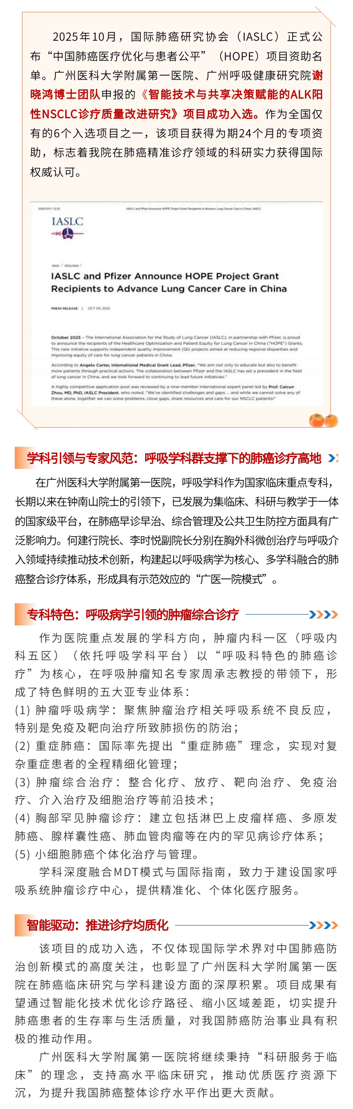 【喜讯速递】广州医科大学附属第一医院谢晓鸿博士团队项目获国际肺癌研究协会(IASLC)“HOPE”计划资助