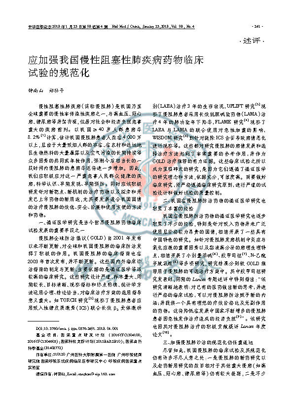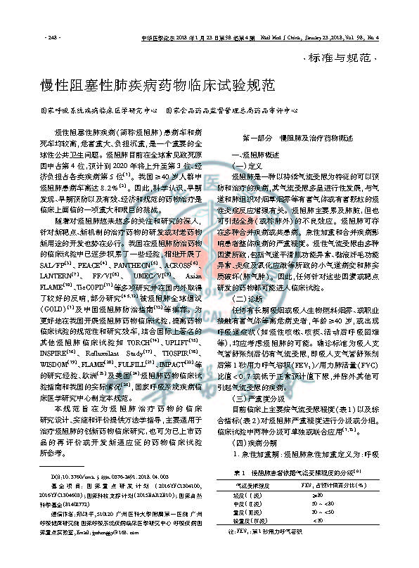 2018年2月27日中华医学杂志刊出了由国家呼吸系统疾病临床医学研究中心(广州医科大学附属第一医院、呼吸疾病国家重点实验室、广州呼吸健康研究院)与国家食品药品监督管理总局药品审评中心(CENTER FOR DRUG EVALUATION,CDE)联合制订的《慢性阻塞性肺疾病药物临床试验规范》(以下简称《规范》),钟南山院士为此发表专题述评《应加强我国慢性阻塞性肺疾病药物临床试验的规范化》。同期还刊发了《慢阻肺临床试验常用评价指标及相关统计分析方法的应用》专题讲座。《规范》的发表旨在为我国慢阻肺治疗药物的临床研究设计、实施和评价提供方法学指导,适用于治疗慢阻肺创新药物的临床研究,也可为已上市药品的再评价或开发新适应证的药物临床试验所参考。