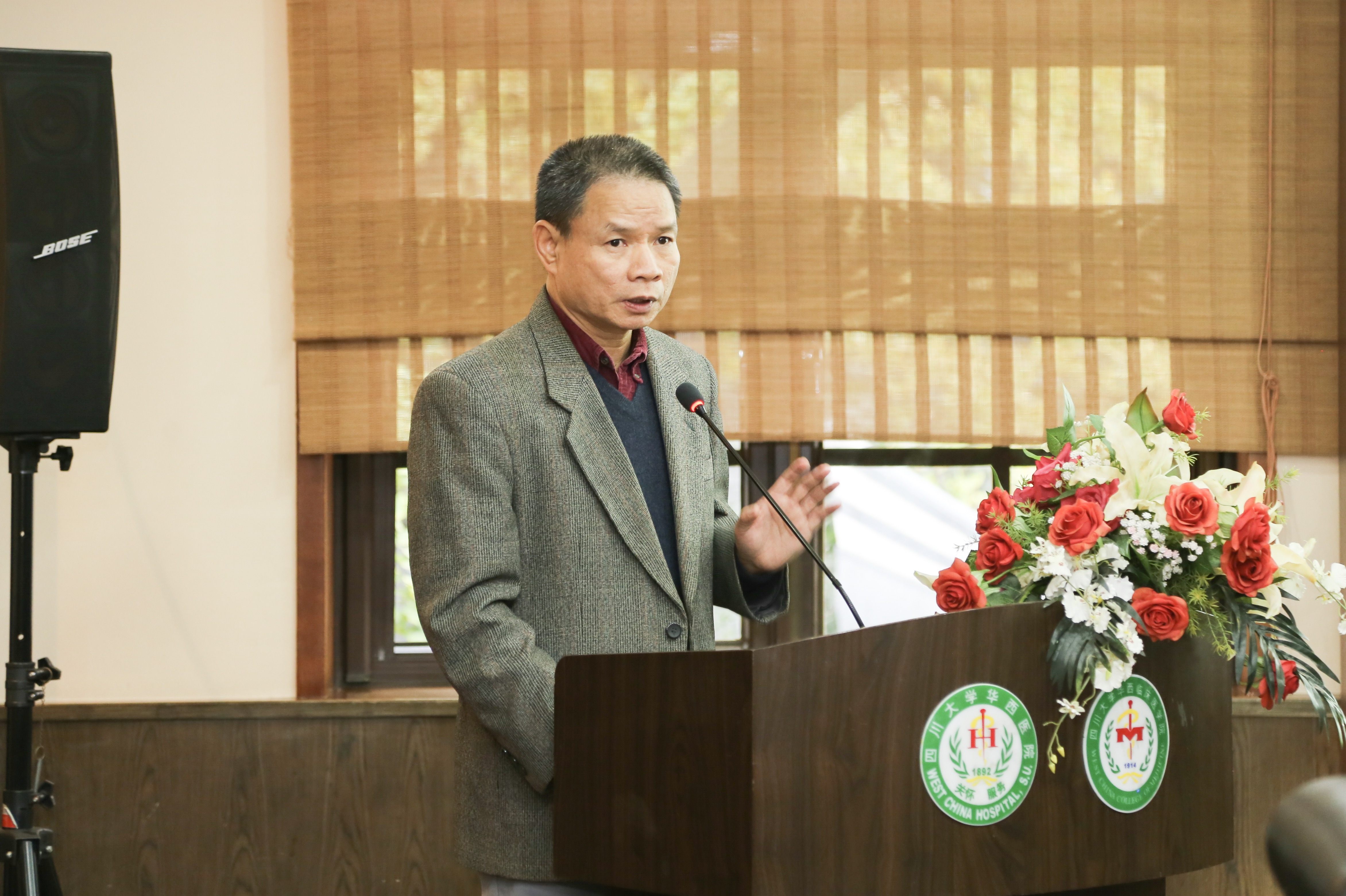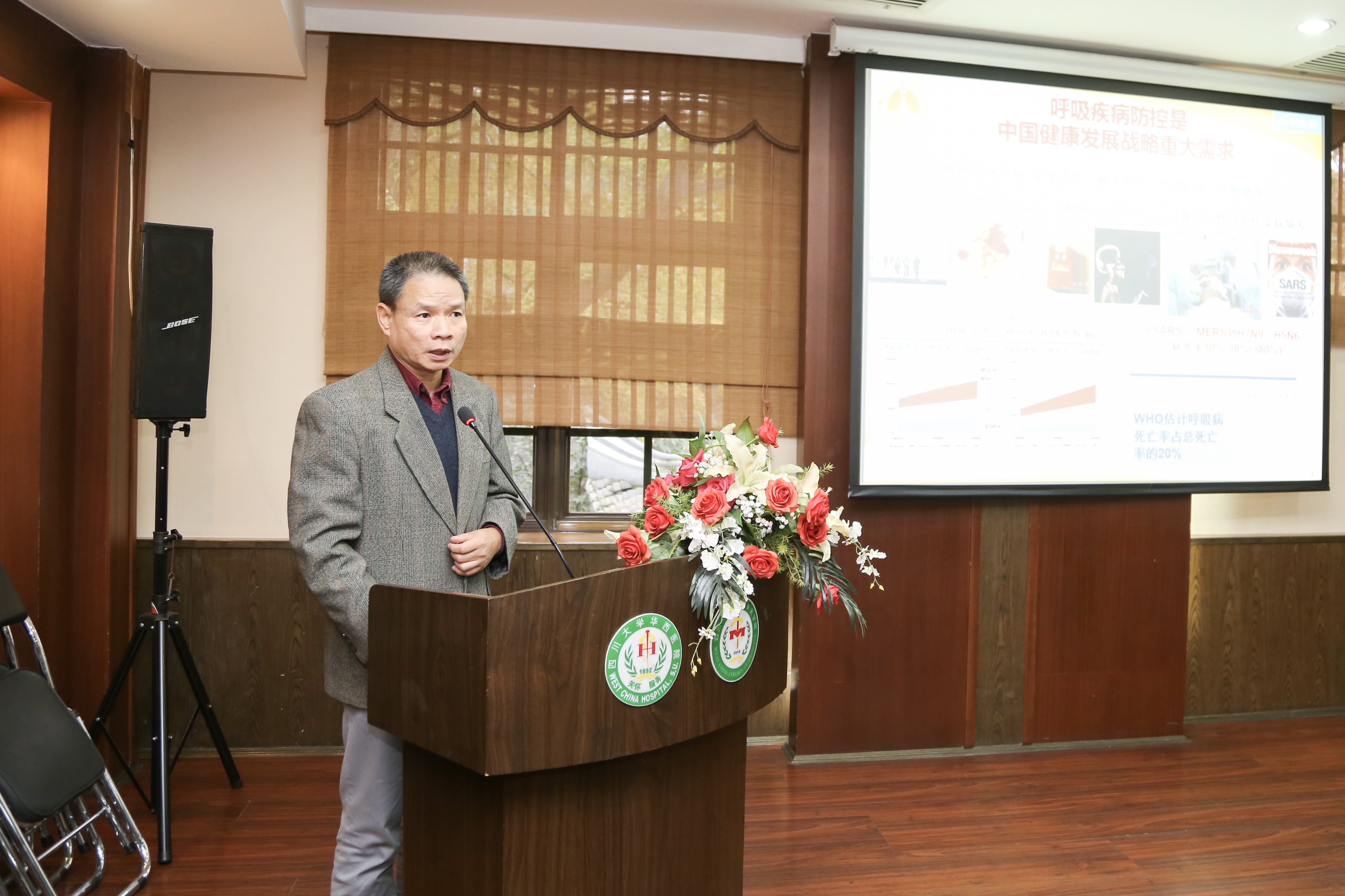 四川大学华西医院内科总支书记、呼吸危重症学科副主任罗凤鸣教授致欢迎辞,热烈欢迎项目组成员莅临华西医院开展临床中心2018年定向国家重点专项项目启动会。专项的立项和工作开展对呼吸内科学科建设的发展有着重要作用,华西医院作为分课题承担单位之一,感谢各项目成员单位对我们工作的支持,预祝项目启动会圆满成功,希望在项目负责人郑劲平教授的指导和各成员单位的共同努力下,很好地完成项目(课题)的任务指标。