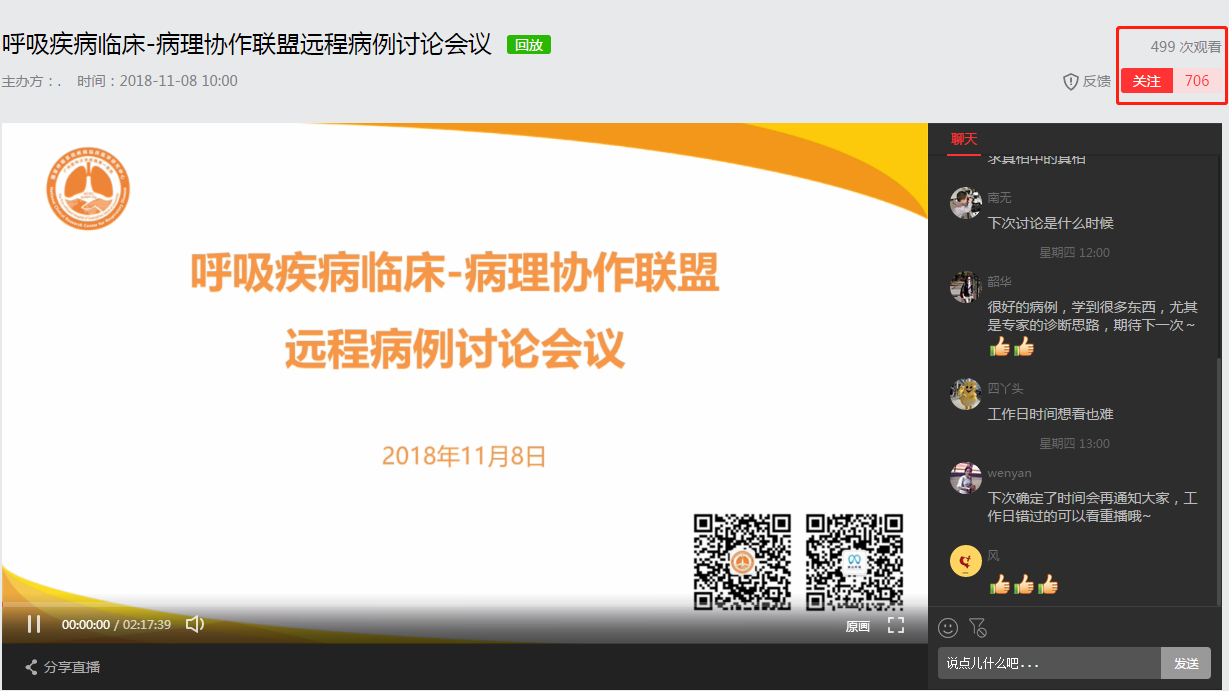 2018年11月8日上午,广州医科大学附属第一医院国家呼吸系统疾病疾病临床医学研究中心(以下简称“临床研究中心”)组织召开全国呼吸疾病临床-病理联盟病理视频网络讨论会。参加视频讨论的单位及专家有:临床研究中心主任钟南山院士、呼吸病理中心顾莹莹教授、广医一院呼吸内科罗群教授、孙宝清教授;北京协和医院冯瑞娥教授;同济大学附属同济医院易祥华教授;南京鼓楼医院孟凡青教授;福建医科大学附属第一医院张声教授,以及全国呼吸病理联盟的其他成员实时线上参与讨论,直播观看点击达499人次。会议由呼吸病理中心顾莹莹教授主持。
