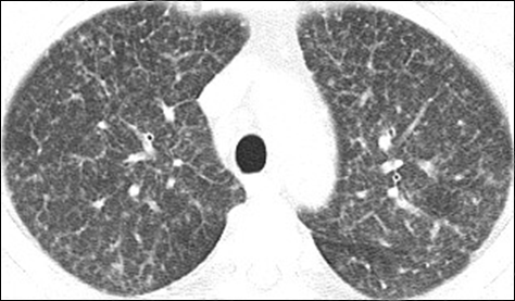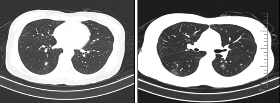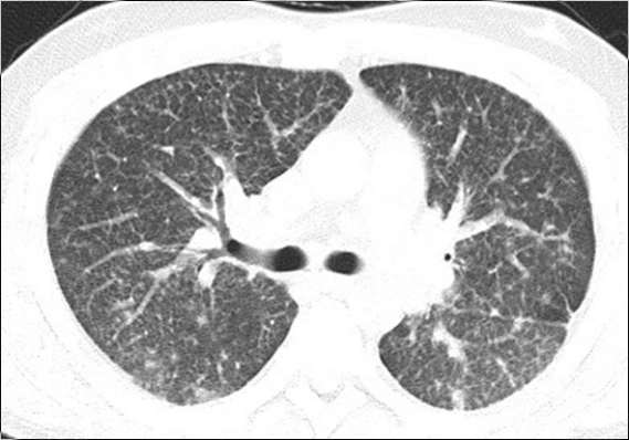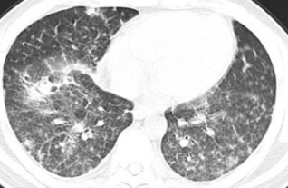 现病史:患者2017年3月受凉出现发热,最高温 39℃,外院考虑“大叶性肺炎”,抗感染治疗40天后退热。2余月后再次发热,最高温 38℃,外院CT:双肺散在淡片及结节影,予以甲强龙治疗3天,热退,停药再次发热。2017年6月来我院就诊,我院血常规:WBC 4.51×109/L,Neut% 73.5%,HGB 87g/L,PLT 89×109/L。ESR 83mm/h,hsCRP 176.26 mg/L。血培养、痰培养、CMV、EBV、G试验、GM试验、T.SPOT.TB均阴性。ANA18项、ANCA3项均阴性。HRCT:双肺弥漫密集分布微结节。PET/CT:右锁骨上代谢异常淋巴结,SUVmax 5.6,双肺弥漫分布大量微结节,多分布于支气管血管束及小叶间隔,摄取轻度增高,SUV1.5-4.3。支气管镜:镜下正常。BALF病原均阴性。TBLB(右下肺):肺泡间质增宽,纤维组织增生,肺泡上皮增生,肺泡见脱落细胞及吞噬细胞。TBLB (左下肺):少许支气管黏膜及肺组织显慢性炎,II型上皮细胞增生,肺泡间隔略增宽,肺泡腔内可见吞噬色素的吞噬细胞聚集,未见明显的纤维化,特染证实部分的吞噬细胞内可见含铁血黄素沉积。特染结果:普鲁士蓝(+)。考虑结核不除外,经四联诊断性抗结核+泼尼松10mg治疗,2017年10月复查HRCT:双肺弥漫性粟粒样结节影,部分新发,其余同前。停用抗结核药和激素,3天后再次发热,最高温39℃,自服中药后降温。2017年12月再次发热。胸增强CT:右下肺肺炎;双肺弥漫性粟粒样结节较前增大。于朝阳医院职业病门诊考虑电焊工尘肺,因该病有自然缓解倾向,予观察。因反复发热,2018年3月朝阳医院就诊,HRCT显示双肺弥漫性异常改变,考虑肺癌或肺内转移瘤伴广泛癌性淋巴管炎可能。朝阳医院职业病科考虑病程进展快,与电焊工尘肺不符。患者2018年4行“VATS右肺上叶楔形、右肺中叶楔形活检术”