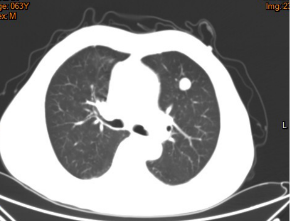 2017年10月5日胸部CT示左肺上叶结节影,边界光整,大小约11*12mm,两肺多发大小不等结节灶。