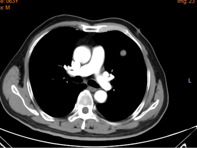 病史:患者十天前因行“腹股沟疝修补术”至胃肠病区就诊,术前查胸部CT示“两肺多发大小不等结节灶,较大者位于左肺上叶”,无咳嗽、咳痰、胸闷、气促,无发热、盗汗、乏力等相关症状,现患者术后恢复良好,为求进一步诊治入我科,门诊拟“肺肿物”收治入院。患者自发病来,神清,精神可,胃钠夜睡眠可,二便无特殊,体重无明显改变。患者有高血压病史,现服用康忻,自述血压波动较大,有心脏病史,2011年行支架植入术,否认糖尿病病史;否认肝炎、结核等传染病病史。