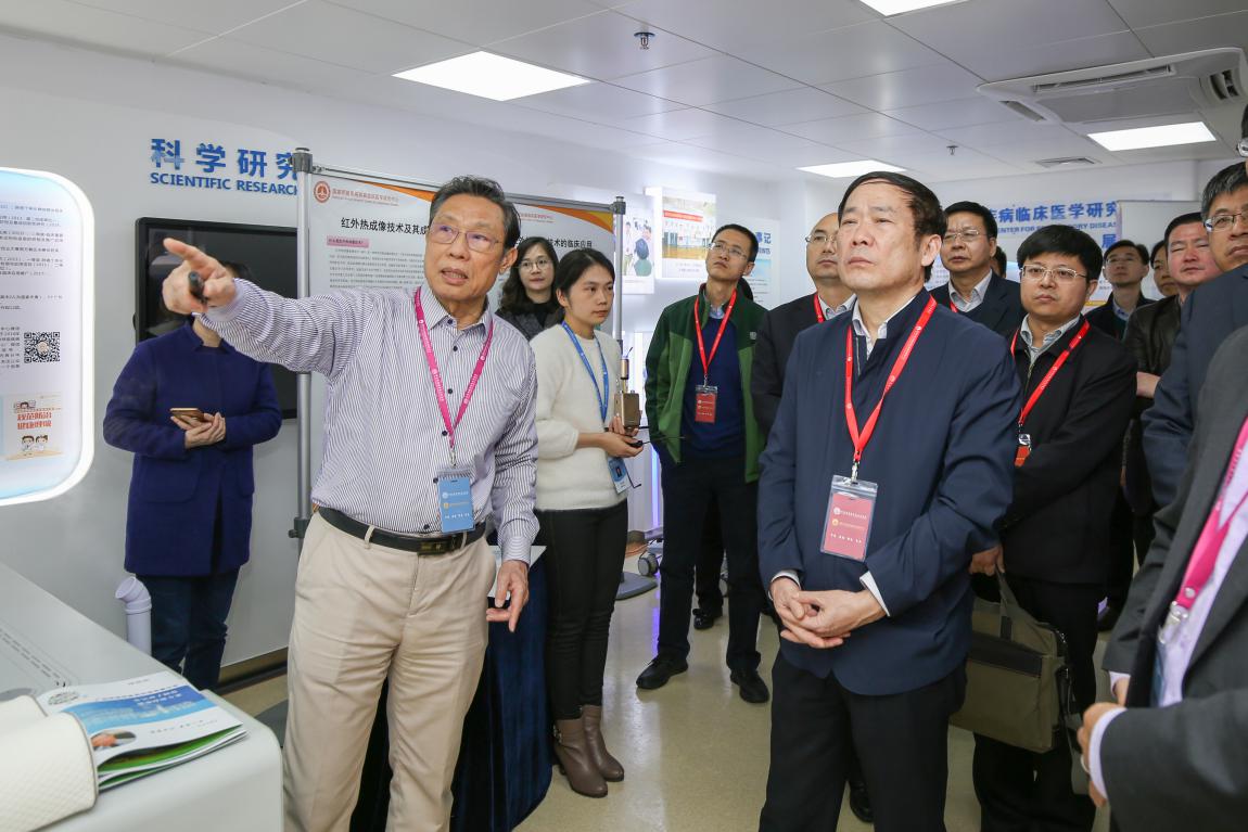 中心主任钟南山院士致辞。首先表达对国家科技部、省科技厅调研领导和专家组到访临床研究中心的热烈欢迎。他指出,2013年科技部着手在全国范围内建立国家临床研究中心至今,全国的临床研究进步是较为快速的,有了临床研究中心的平台,我们更容易搭建全国性的临床研究网络,通过网络可以组织更多的多中心临床研究,也更容易实现成果转化。临床中心最重要的是做好转化和推广,这是科技部给我们的指导思想,我们不能只做高精尖的技术,而更要发展适合国情的、简便、价廉、安全有效的医疗器械和产品、药品,这是我们总的指导思想。改革开放四十年,中国在很多方面尤其是经济发展取得了巨大成就,国内科技工作能否也如此,在中国现有的体制下,利用好发展规律,赶超国外。我们有着两个方面的有利条件:(1)我国人口在世界占比较大;有着非常丰富的临床研究资源,这是我们临床研究的基础。(2)政府组织力强大;例如,早期慢阻肺治疗在国外一直没有实现,但是我们做成功了,因为我们有政府的组织、政府的指导,这是很关键和有利的方面。