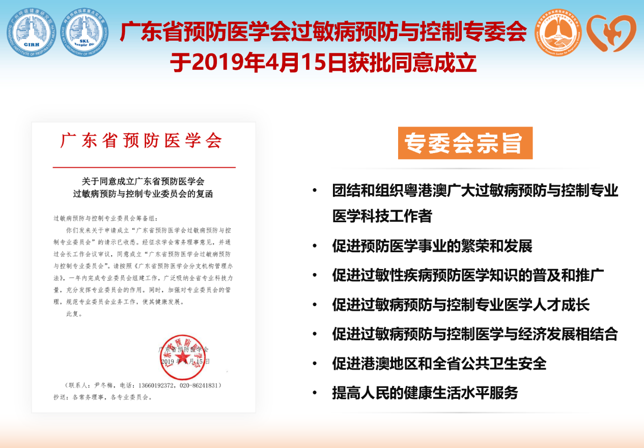 孙宝清教授介绍广东省预防医学会过敏病预防与控制专委会工作:筹备组在2019年1月开展调研广东省过敏病预防与控制概况,结合国家预防为主,主动健康的策略和粤港澳地区联动大健康的发展机遇。同年3月初向广东省预防医学会总会递交专委会成立申请材料,在总会的支持下,于4月15日获得同意专委会成立的批复。专委会筹备期间,粤港澳地区过敏病预防与控制专业医学科技工作者积极响应专委会成立。截至5月15日,发展首批成员达180人,覆盖港澳两个特别行政区、广东省2个副省级市和16个地级市。