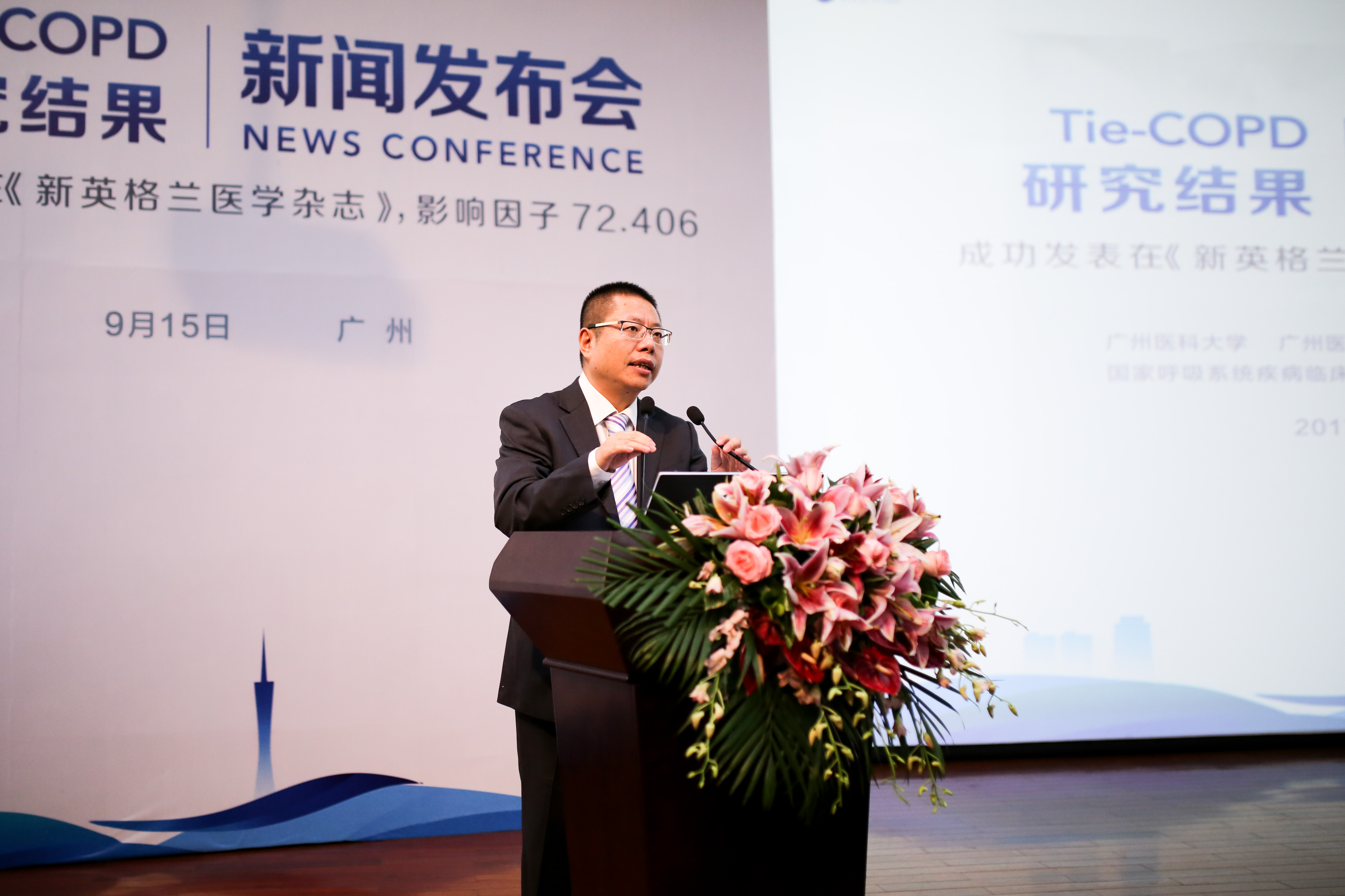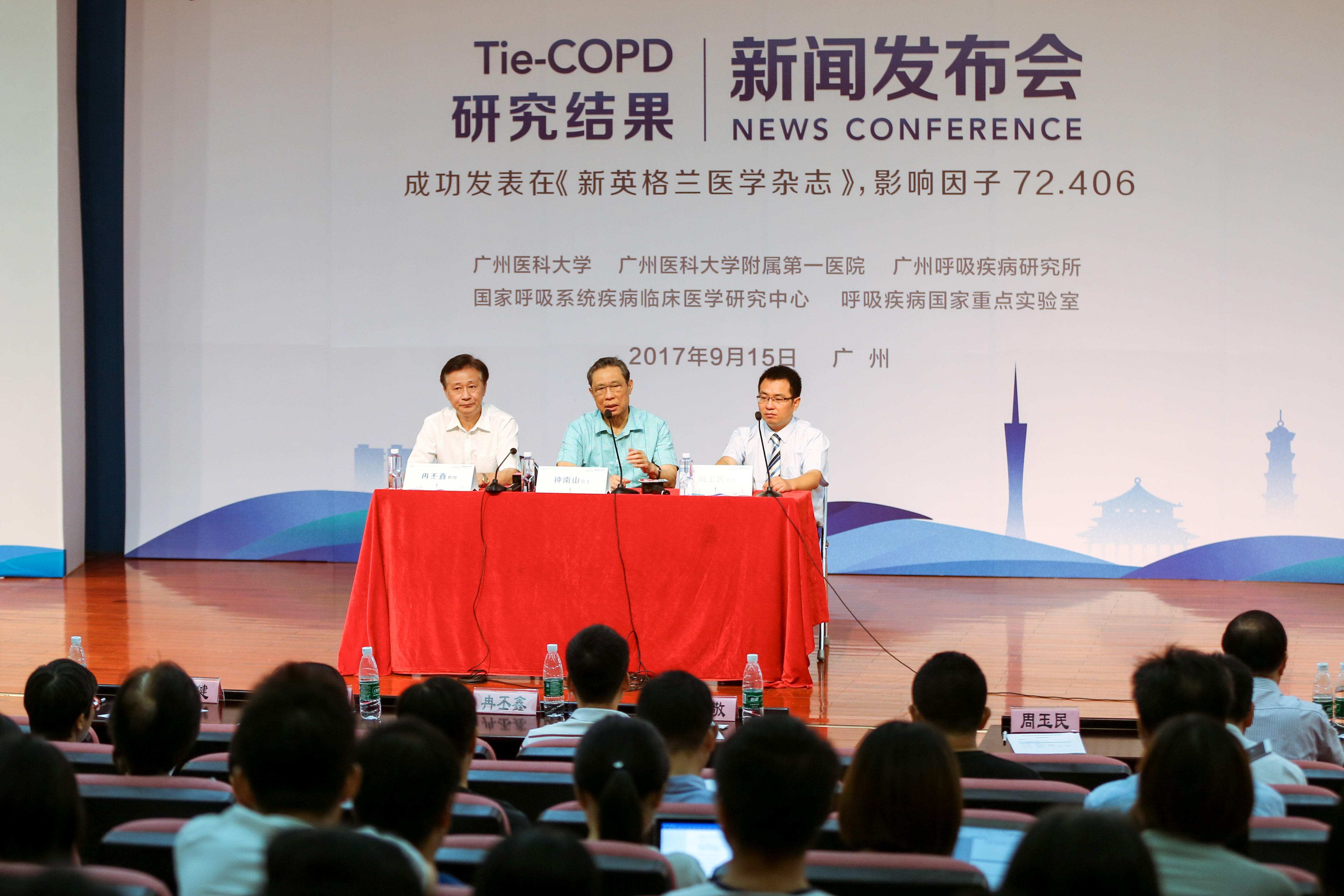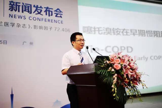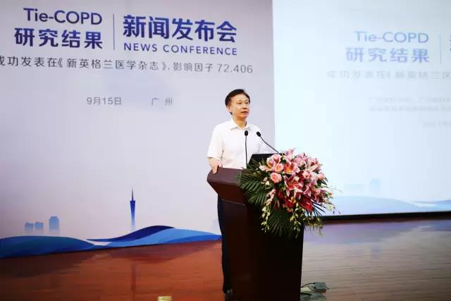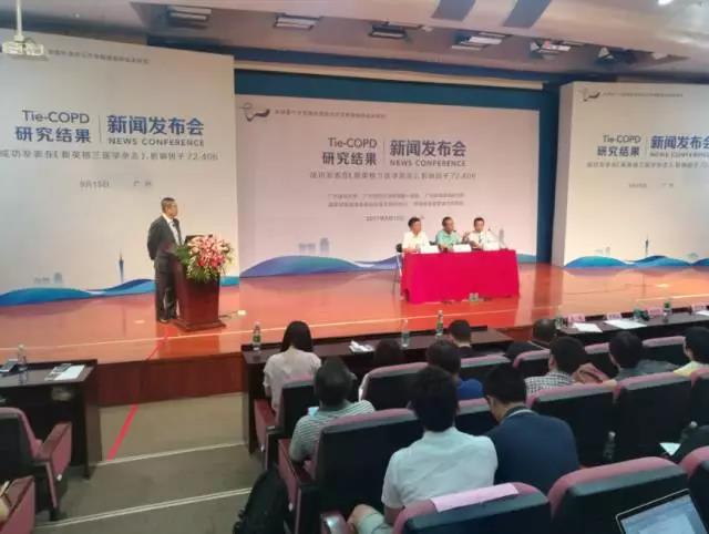 2017年9月15日,一项由广州医科大学附属第一医院、广州呼吸健康研究院、国家呼吸系统疾病临床医学研究中心、呼吸疾病国家重点实验室牵头、国内多家医院参与的,针对早期慢阻肺治疗的大型临床研究结果在国际顶级学术刊物《新英格兰医学杂志》上发表。该研究结果显示,噻托溴铵治疗早期慢阻肺患者能有效提高肺功能、改善生活质量和减少急性加重,同时观察到了肺功能下降的速率有所减缓。今天,该研究发表新闻发布会在广州医科大学附属第一医院举行。会上,该文章的共同第一作者、中国工程院院士、国家呼吸系统疾病临床医学研究中心主任钟南山教授和文章的通讯作者、广州呼吸健康研究院、呼吸疾病国家重点实验室主任冉丕鑫教授共同呼吁,要重塑慢阻肺诊治的理念,重视早期诊断和早期治疗。