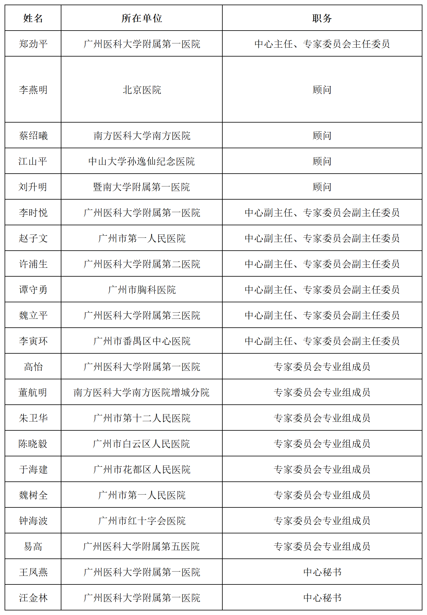 广州市呼吸疾病医疗质量控制中心成员名单