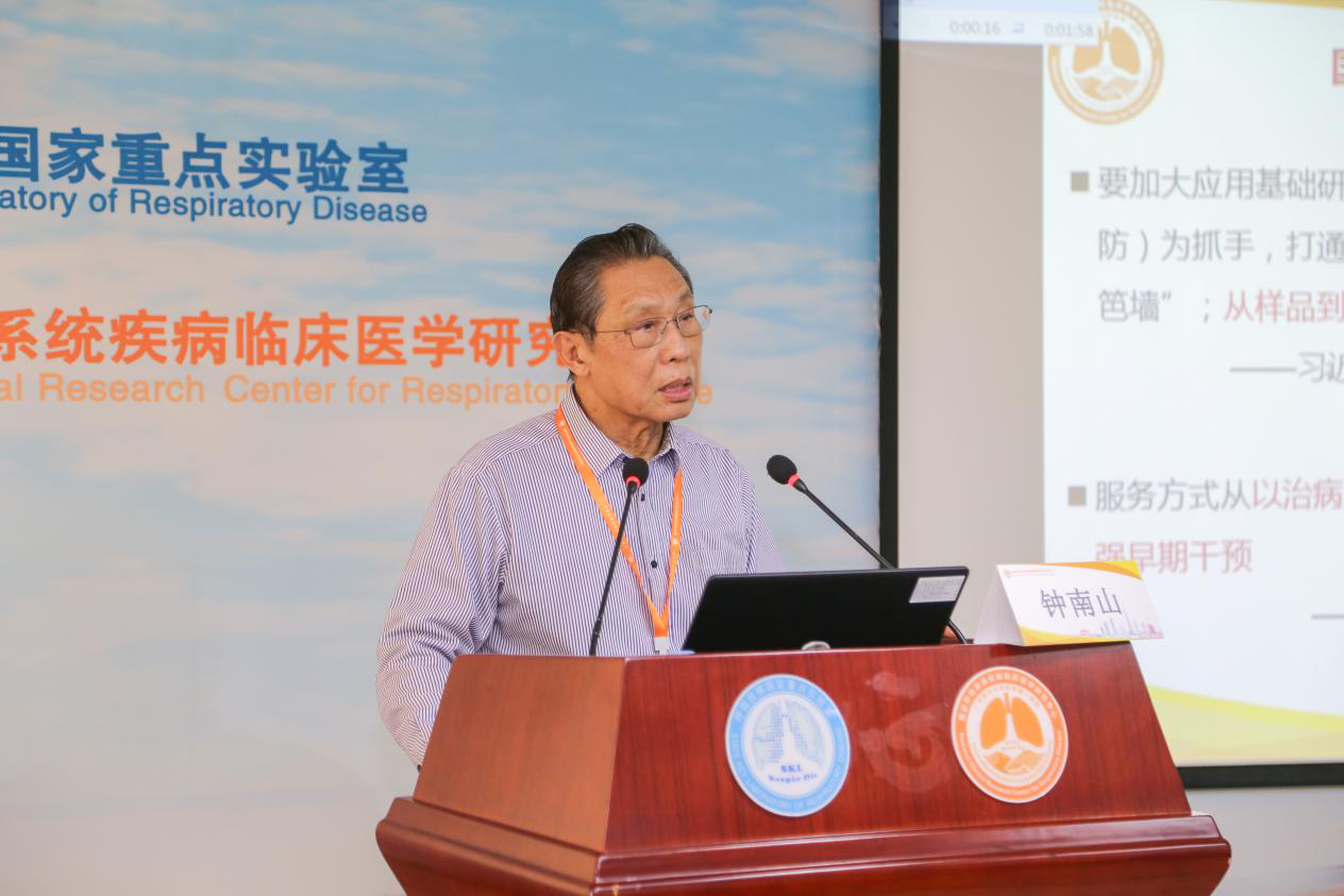 紧接着,中心主任钟南山院士作临床研究中心工作汇报,报告围绕临床研究中心发展历程与战略定位、基础平台建设、“双转化、双推广”、多中心研究与多学科协作、产学研平台建设等方面的代表性成果进行汇报。报告中指出,重点措施是求突破、抓重点、建平台。临床中心创新性地提出慢阻肺早诊早治战略、阻塞性睡眠呼吸暂停早期干预对心血管事件发生的影响、术后辅助化疗人群精准筛查策略,建立肺功能检查标准及规范化培训,推广咳嗽诊治检查技术、无管化麻醉及微创技术等适宜技术。汇报中提及中心建设发展的规划和展望在于国家呼吸中心将建成融合六大功能的综合基地。