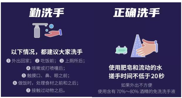2019-nCoV通过飞沫和接触传播。注意咳嗽、喷嚏时使用纸巾或屈肘遮掩口鼻,防止飞沫传播。不要打完喷嚏后揉眼睛或者接触其他粘膜部位。最新报道的美国病例,患者的粪便、上呼吸道样本、鼻咽和口咽拭子检测2019-nCoV均呈阳性,广州确诊病例家中门把手查出病毒核酸,提示我们一定重视加强手卫生!咳嗽、饭前便后、接触或处理宠物粪便后,要用流动的水洗手,或者使用含酒精成分的免洗洗手液。科学正确的保证手卫生可有效将接触感染的风险降到最低。