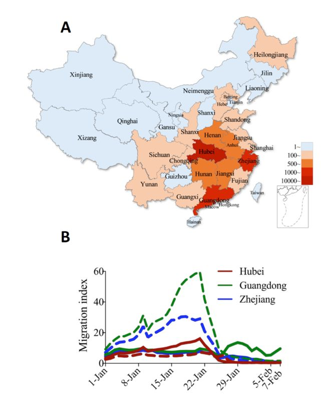 自本文分析以后,真实流行趋势已证实与本研究预测曲线相吻合。在上周,广东省和浙江省已报道每天的新增病例少于6例,而湖北的新增病例也同样呈现下降的趋势。对于广东省和浙江省,移动人口已经逐渐开始返程(由于依然存在限制,因此与前几年返程相比,迁移率会相对较低),从而引发了潜在病例进入的担忧。目前只有湖北省依然有大量病例,其他省份迁移人口可能不会构成重大风险。广东省和浙江省实行持续的早期发现与随后进行的隔离措施对于防止第二次流行高峰的出现是很有效的。