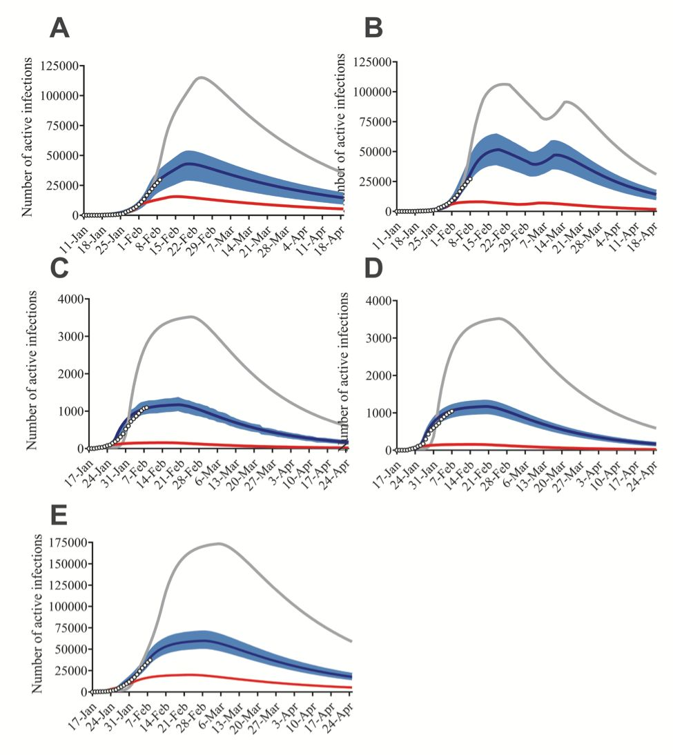 图2. 改进的SEIR模型预测曲线 (A)湖北省有严格管控,(B)湖北省减少管控力度,(C) 广东省,(D) 浙江省和(E)中国在1月23日(蓝色),5天后(灰色)和5天前(红色)采取干预措施时的流行曲线,把每天现存确诊病例的实际数据被拟合到曲线 (圆圈)上