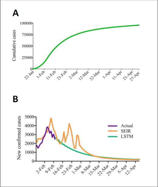 图3. (A)LSTM预测的全国COVID-19病例累计数量,(B)根据实际数据(紫色)、SEIR模型(橙色)和LSTM模型(绿色)计算的COVID-19新增病例数