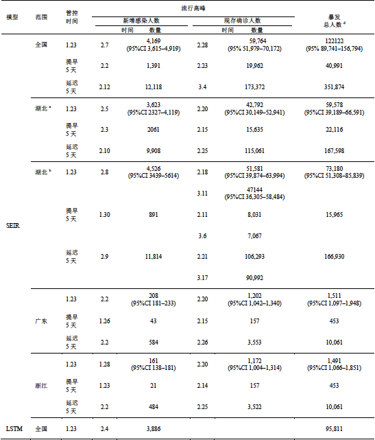 为了应对1月15日开始暴发的COVID-19疫情,中国宣布启动一级应急响应(最高级别公共卫生响应),在全国范围内实施了管控措施。除了封锁武汉及其他邻近地区以外,还要求必须严格报告往返湖北省的情况。同时,不鼓励湖北居民返回工作地,而且即便是经过武汉的非湖北居民,也被要求进行14天的自我隔离。然而,武汉封城的有效性和必要性受到了质疑,还有报道称这样的做法是否太晚[13-14]。Wu等学者预测,如果不采取控制措施,武汉的疫情规模将在1月25日达到17.5万例,疫情将在4月达到高峰[13]。同样,Read等人预测,在没有控制措施的情况下,将在2月4日达到高峰,高达19万例[14]。值得注意的是,他们预测到在武汉大规模封城的情况下,中国其他城市也仍将经历与武汉相似的疫情增长。然而,事实并非如此。广东和浙江是受影响仅次于湖北的两个省份,仅占全国PCR确诊病例的6.6%。与武汉相比,这两个省控制措施出台相对较快。因此,相比于湖北,该两省疫情增长放缓,说明了隔离和管控措施是有效的。本模型同样预测,延后5天执行控制措施将使疫情规模增加至3倍。