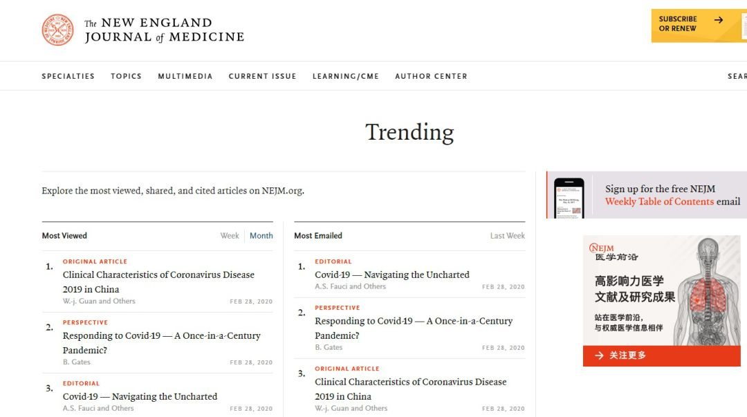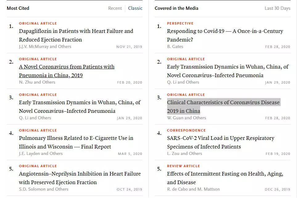论文一经发表,即引起广泛关注。在1周不到的时间内,论文已经成为《新英格兰医学杂志》浏览量最高、广泛致信交流、广泛被各界媒体采访报道的重点推介(图5)。此外,论文发表5天内已经被4篇国际学术论文引用。