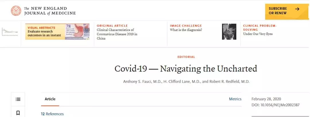 《新英格兰医学杂志》高度重视新冠疫情,美国国立卫生研究院的Anthony Fauci、Clifford Lane、Robert Redfield教授撰写了题为Covid-19 -- Navigating the uncharted文章,提出本研究的发现提示新冠疫情最终可能更类似于季节性流感(病死率接近0.1%)或者流感大流行(类似于1957和1968年的大流行),而与SARS或者MERS的高病死率(分别为9-10%、36%)形成鲜明对比。