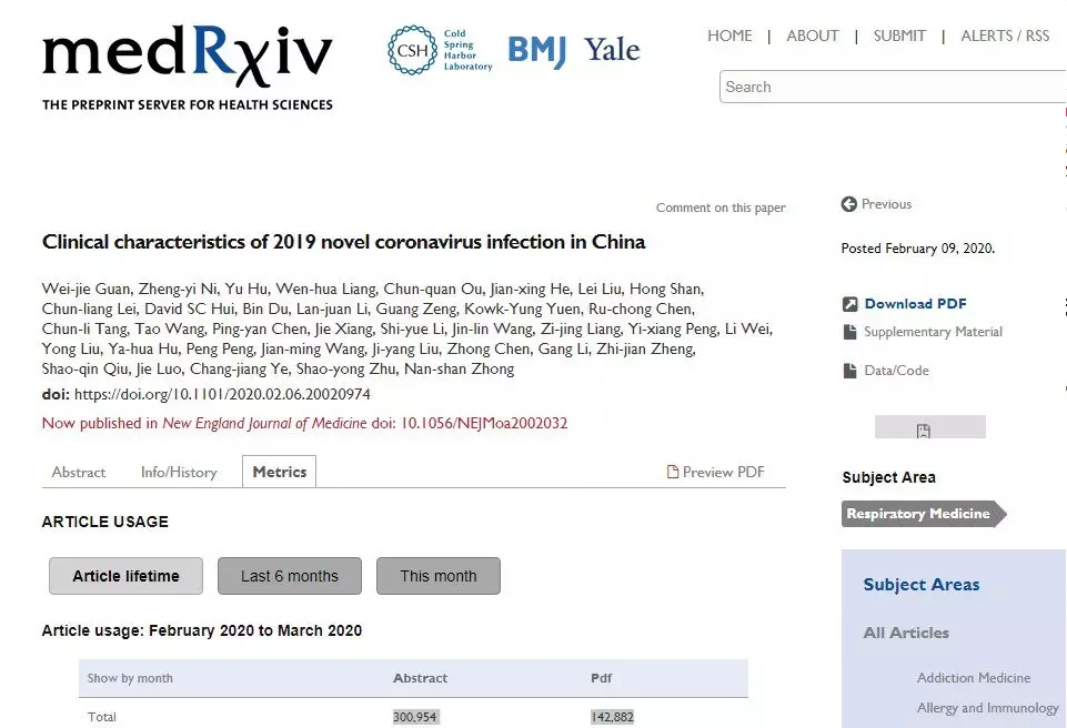 钟院士一直强调,临床救治必须时刻摆在抗击新冠疫情的首位,临床和基础科研为临床实践保驾护航,两者形成有机整体。基于上述指导思想,在分析整理数据后,钟院士带领团队第一时间向医学预印本(MedRxiV)上传了文章的副本(https://www.medrxiv.org/content/10.1101/2020.02.06.20020974v1.article-metrics),将研究成果尽快向全社会公布,随即引起了全社会的广泛关注(截止至3月5日,浏览次数达30万,下载量近14.3万次)(图3)。