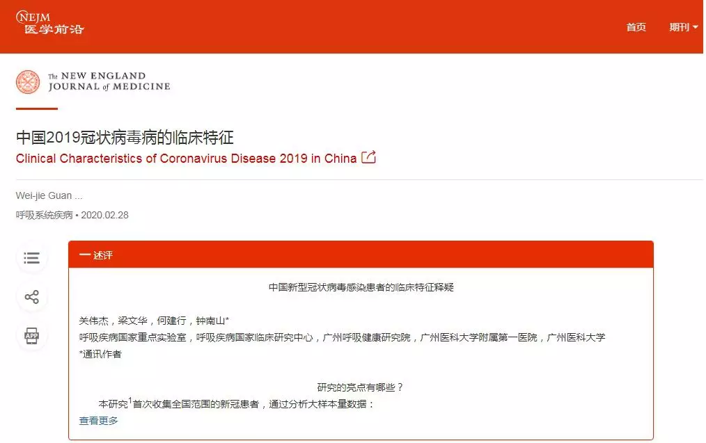 在国家卫健委的支持与协调下,钟南山院士牵头收集了自2019年12月11日至2020年1月29日来自全国30个省/自治区/直辖市共552家医院的1099例实验室确诊的新型冠状病毒感染(下文简称为新冠感染)患者的临床信息。研究论文以原创论著(Original article)的形式,正式刊登在医学界影响力最高的综合医学杂志——《新英格兰医学杂志》上(链接:https://www.nejm.org/doi/full/10.1056/NEJMoa2002032)。