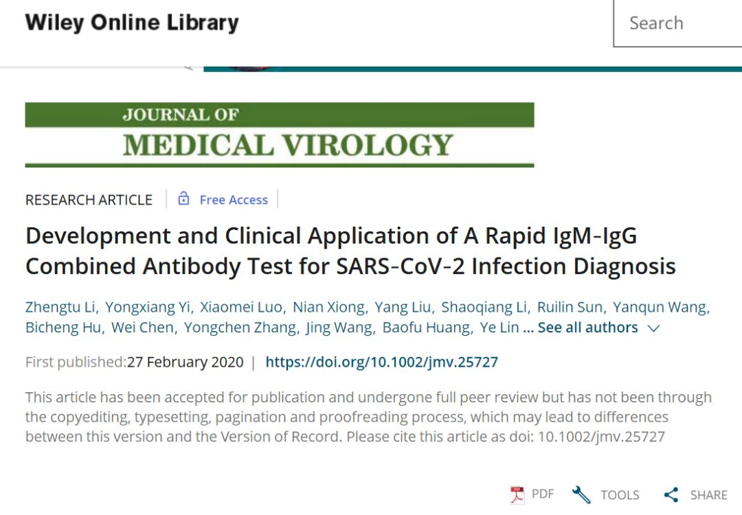 2月28日,以国家呼吸系统疾病临床医学研究中心、广州医科大学附属第一医院、广州呼吸健康研究院为第一研究单位,呼吸感染专家叶枫主任为通讯作者,在《医学病毒学杂志》(Journal of Medical Virology)在线发表了一篇题目为“Development and Clinical Application of A Rapid IgM-IgG Combined Antibody Test for SARS-CoV-2 Infection Diagnosis” 的研究论文,该论文初次描述了SARS-CoV-2 IgM-IgG联合抗体检测试剂的研发,以及在新冠病毒感染性疾病(COVID-19)临床诊断中的应用。