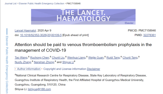 2020年4月9日,广州医科大学附属第一医院国家呼吸系统疾病临床医学研究中心钟南山院士团队李时悦教授、张挪富教授、刘春丽教授在Lancet Haematol(IF=11.99)上发表文章“Attention should be paid to venous thromboembolism prophylaxis in the management of COVID-19”。本研究指出,临床上在新型冠状病毒肺炎(COVID-19)患者的救治过程中,应重视静脉血栓栓塞症的预防。