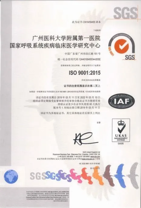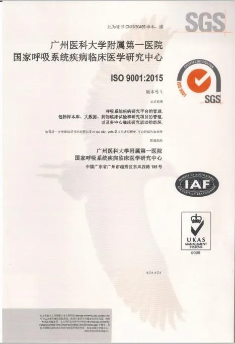广医一院国家呼吸系统疾病临床医学研究中心(以下简称“临床研究中心”)自2019年3月正式通过ISO 9001:2015质量管理体系认证以来,定期接受SGS公司监督审核质量管理体系运行工作情况。2020年5月6-8日,SGS公司对临床研究中心实施ISO 9001:2015质量管理体系复审工作,审核专家分别对临床研究中心综合办公室、医疗大数据部、生物样本资源库管理部三个部门进行了现场审核,主要审核范围是呼吸系统疾病研究平台的管理,包括样本库、大数据、药物临床试验和研究项目的管理,以及多中心临床研究活动的组织。经过严格审核,审核专家认为证书持续有效,临床研究中心顺利通过ISO 9001:2015质量管理体系复审。