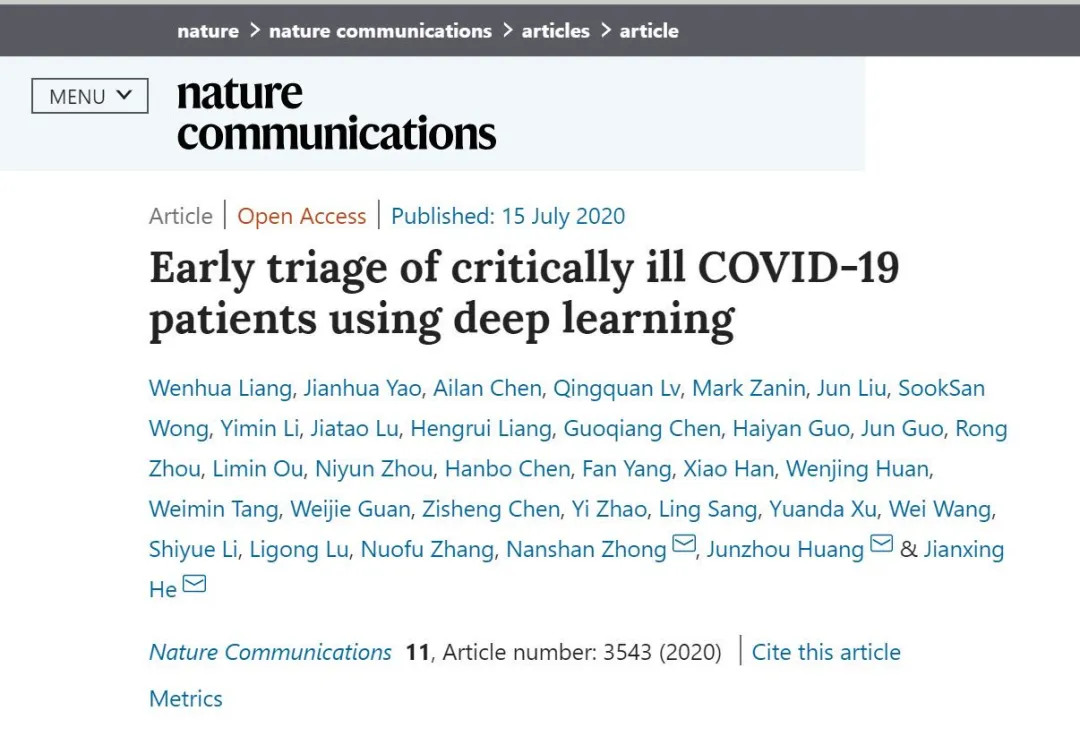 这项名为《深度学习在新冠肺炎危重患者早期分诊中的应用》的研究,是钟南山院士团队与腾讯公司共同成立的大数据及人工智能联合实验室的成果之一,第一作者分别是临床研究中心骨干、广州呼吸健康研究院院长助理梁文华博士,以及腾讯AI Lab医疗中心首席科学家姚建华博士,临床研究中心主任钟南山院士、副主任何建行教授、腾讯AILab医疗中心负责人黄俊洲均为共同作者。