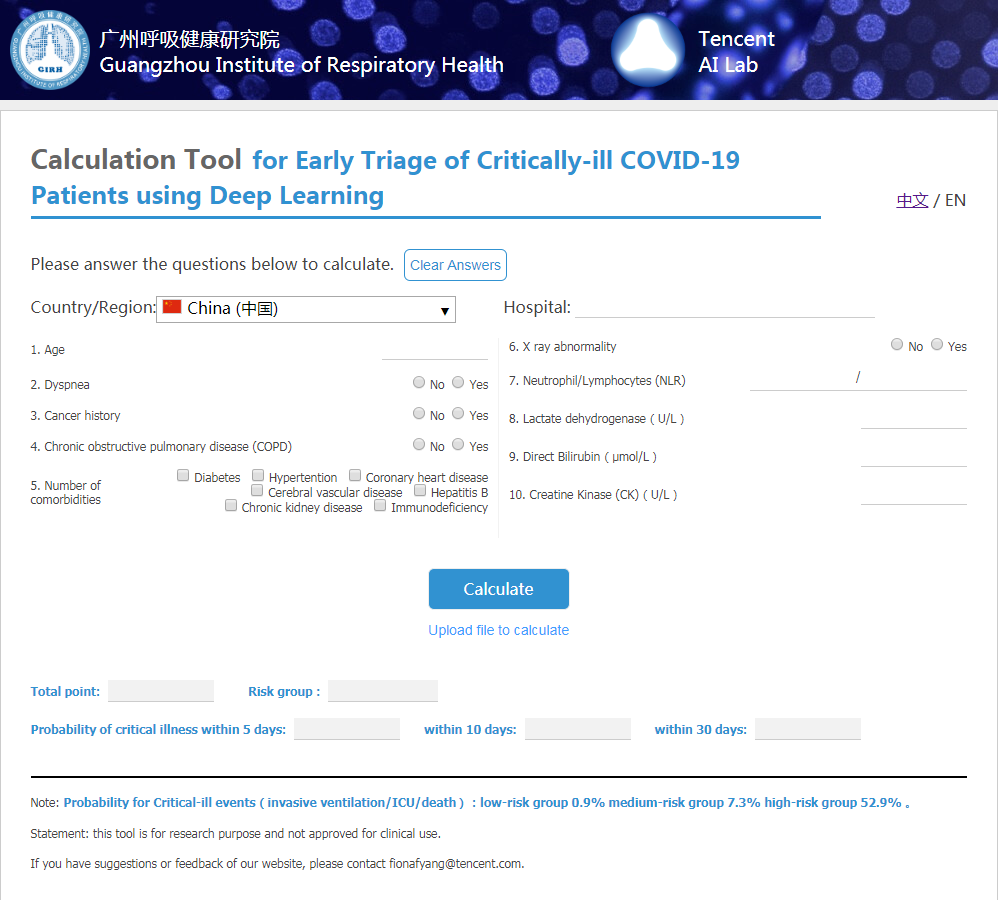 依据此模型开发出的预测工具“COVID-19患者重症早期分诊系统”已经在线公开于https://aihealthcare.tencent.com/COVID19-Triage_en.html,临床医护工作人员也可以访问微信小程序获得这一工具。