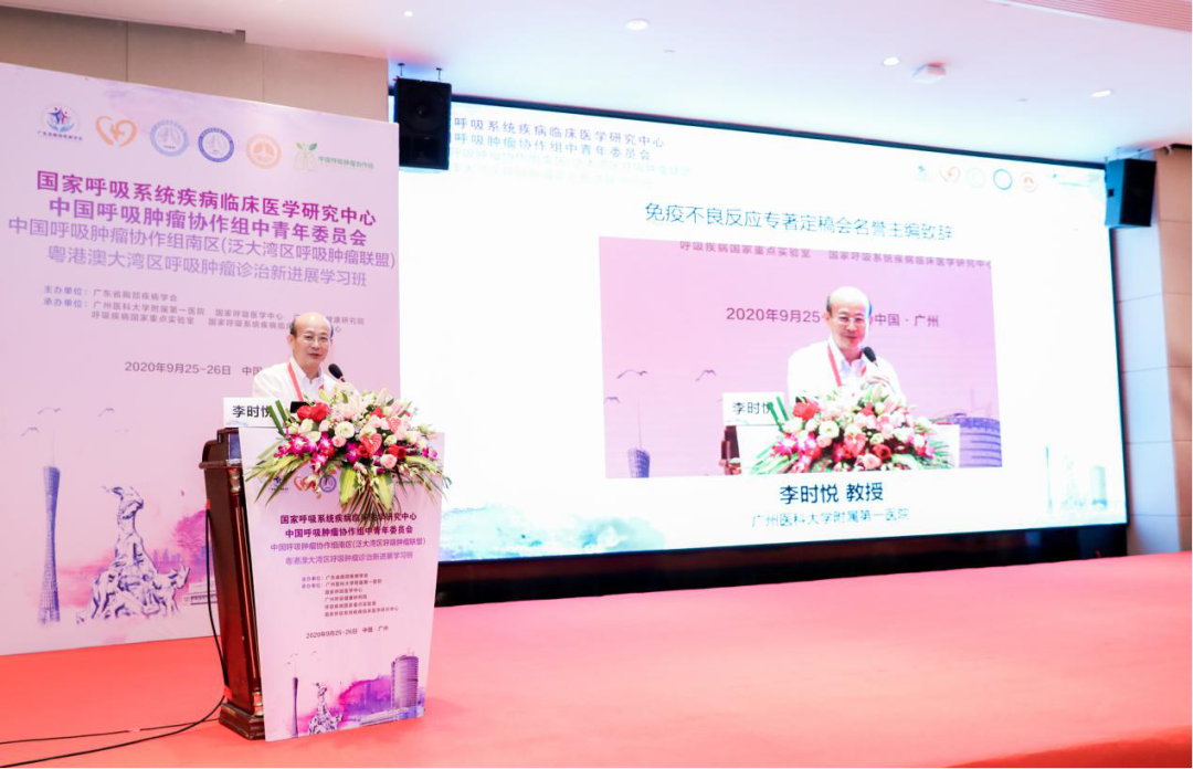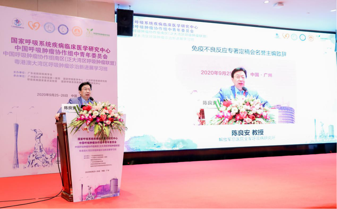 广州医科大学附属第一医院周承志教授担任大会主席。大会首先由“共和国勋章”获得者临床研究中心主任钟南山院士通过视频开幕致辞;其后广州呼吸健康研究院院长/临床研究中心副主任何建行教授、广州呼吸健康研究院副院长李时悦教授、解放军总医院全军呼吸病研究所陈良安教授以及AME杂志社社长汪道远社长分别致辞并祝贺《重度免疫治疗不良反应病例集萃及管理共识》专著定稿。