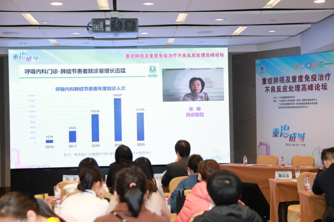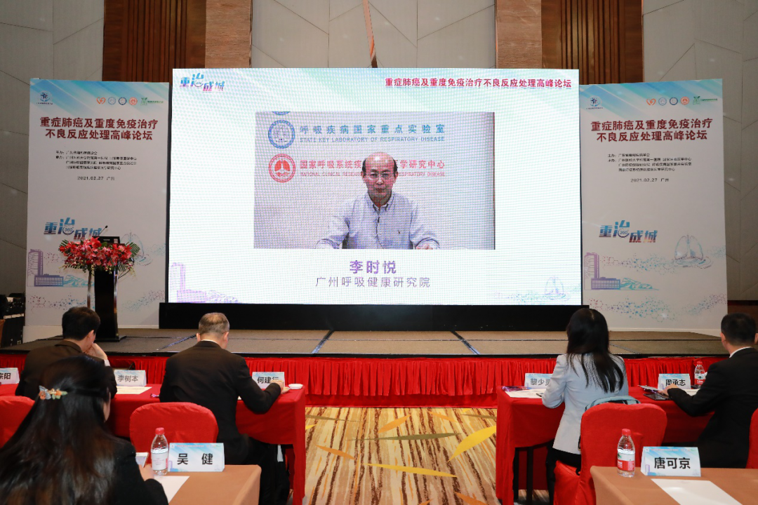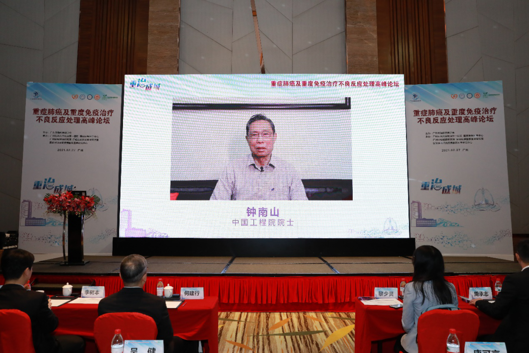 2021年2月27日,新年伊始,元宵节后,由广东省胸部疾病学会主办,广州呼吸健康研究院、国家呼吸医学中心、国家呼吸系统疾病临床医学研究中心、广州医科大学附属第一医院、中国呼吸肿瘤协作组联合承办的“重症肺癌及重度免疫治疗不良反应处理高峰论坛”在广州隆重举行。钟南山院士、何建行教授、李时悦教授、陈良安教授、韩宝惠教授、李为民教授、胡成平教授、宋勇教授、周建英教授为大会主席团成员,周承志教授为大会执行主席,全国各地的呼吸肿瘤领域专家学者,通过线上线下相结合的方式相聚,共议重症肺癌及免疫治疗重度不良反应新进展,刘明教授主持大会。