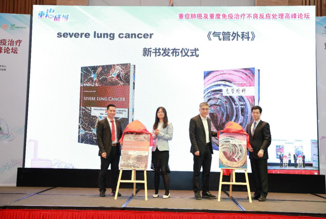 (从左至右)周承志教授、黎少灵女士、何健行教授、李树本教授为《重症肺癌》专刊及《气管外科》揭幕发布。