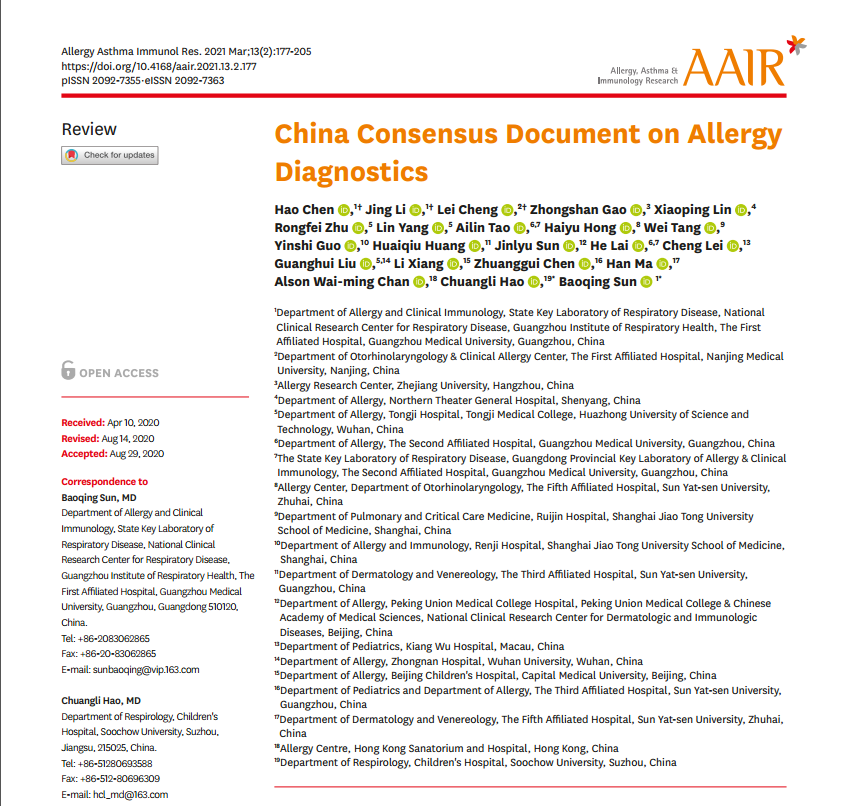 近日,国际过敏领域的专业期刊Allergy Asthma Immunol Res (AAIR)杂志(IF:4.157)在线发表了过敏原诊断中国共识,该共识在中华预防医学会过敏病预防与控制专委会,中国研究型医院变态反应分会以及中华预防过敏原诊断学组、广东省预防医学会过敏病预防与控制专委会的支持下,汇聚了16家大型教学医院共22名内地以及港澳过敏反应领域的专家(名单见文末)共同完成,该共识的第一作者为广州呼吸健康研究院陈浩博士、李靖教授以及中华医学会变态分会候任主任委员、南京医科大学附属第一医院耳鼻喉科程雷教授,通讯作者为苏州大学附属儿童医院郝创利教授以及广州呼吸健康研究院孙宝清教授。这是我国首部关于过敏性疾病的病因诊断的指南性文件。