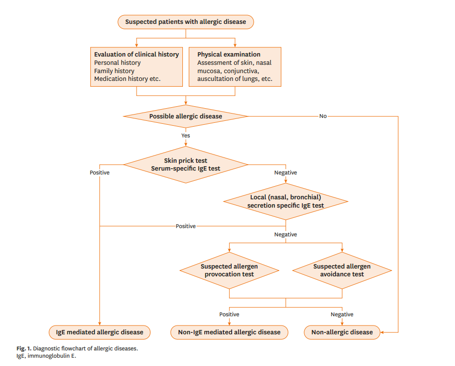 疑似过敏性疾病的患者,首先进行病史评估以及必要的体格检查,再进行过敏原皮肤试验与血清特异性IgE检测,若为阳性,则为IgE介导的过敏性疾病;若皮肤试验与血清特异性IgE均为阴性,则进行局部(鼻腔、支气管)分泌物的特异性IgE检测,阳性结果提示IgE介导的过敏性疾病,常见的局部过敏性鼻炎或者局部过敏性哮喘;若局部分泌物特异性IgE检测阴性,则需要进行过敏原激发或者过敏原回避试验,阳性者考虑非IgE介导的过敏性疾病,而阴性则排除过敏性疾病。